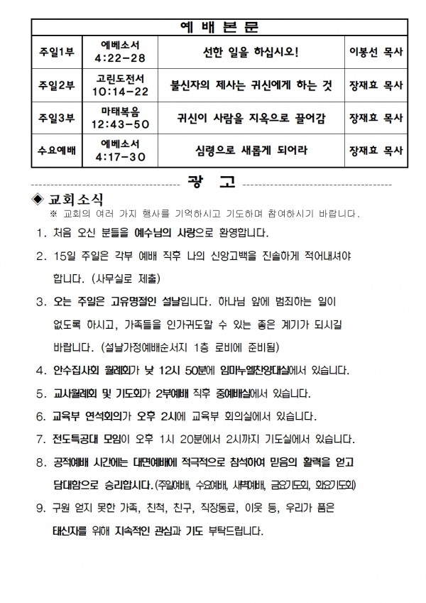 2023년 1월 15일 예배본문 & 교회소식 페이지 정보 작성자 성은교회 작성일23-01-13 15:43 조회5,329회 관련링크 이전글 다음글 목록 본문 2023년 1월 15일 예배본문 & 교회소식 이전글 다음글 목록