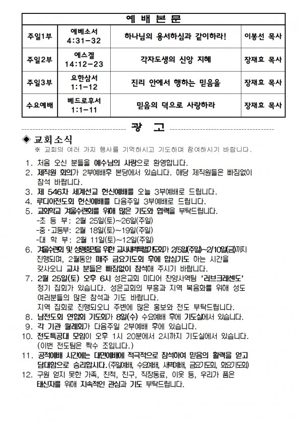 2023년 2월 5일 예배본문 & 교회소식 페이지 정보 작성자 성은교회 작성일23-02-03 17:34 조회5,324회 관련링크 이전글 다음글 목록 본문 2023년 2월 5일 예배본문 & 교회소식 이전글 다음글 목록