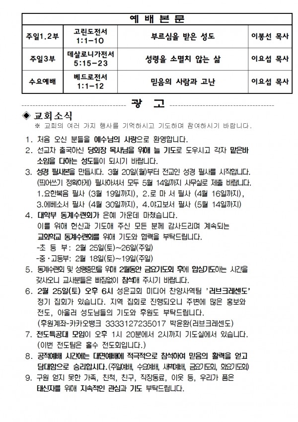 2023년 2월 19일 예배본문 & 교회소식 페이지 정보 작성자 성은교회 작성일23-02-17 15:59 조회5,286회 관련링크 이전글 다음글 목록 본문 2023년 2월 19일 예배본문 & 교회소식 이전글 다음글 목록