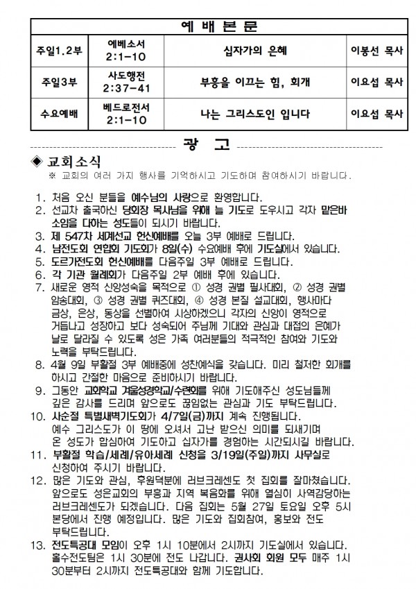2023년 3월 5일 예배본문 & 교회소식 페이지 정보 작성자 성은교회 작성일23-03-03 17:40 조회5,252회 관련링크 이전글 다음글 목록 본문 2023년 3월 5일 예배본문 & 교회소식 이전글 다음글 목록