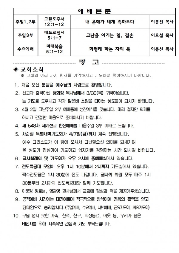 2023년 3월 26일 예배본문 & 교회소식 페이지 정보 작성자 성은교회 작성일23-03-24 17:04 조회5,173회 관련링크 이전글 다음글 목록 본문 2023년 3월 26일 예배본문 & 교회소식 이전글 다음글 목록