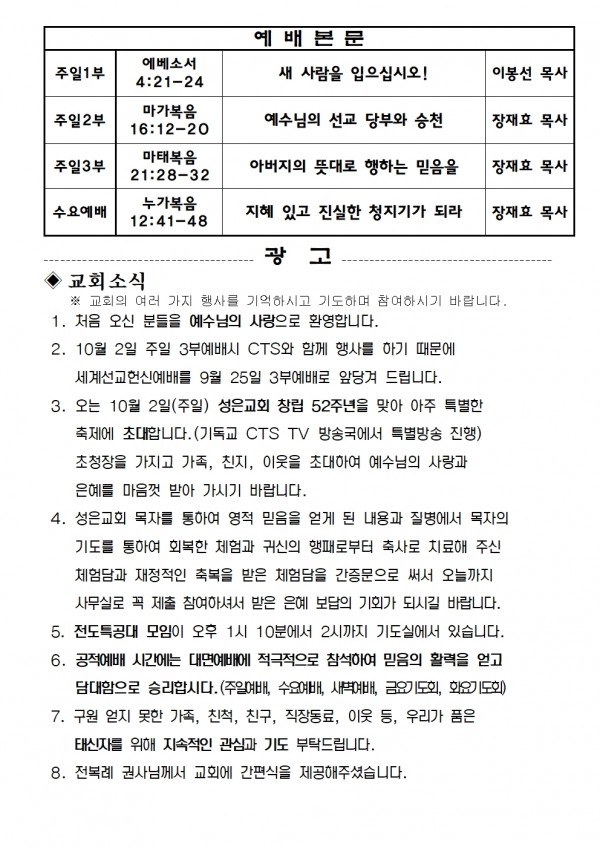 2022년 9월 18일 예배본문 & 교회소식 페이지 정보 작성자 성은교회 작성일22-09-16 16:29 조회5,499회 관련링크 이전글 다음글 목록 본문 2022년 9월 18일 예배본문 & 교회소식 이전글 다음글 목록