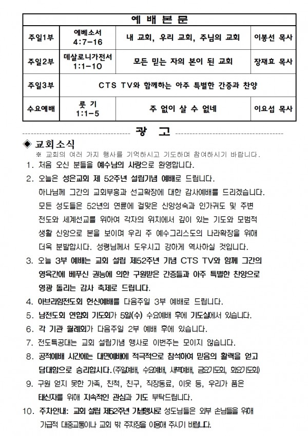 2022년 10월 2일 예배본문 & 교회소식 페이지 정보 작성자 성은교회 작성일22-09-30 15:42 조회5,524회 관련링크 이전글 다음글 목록 본문 2022년 10월 2일 예배본문 & 교회소식 이전글 다음글 목록