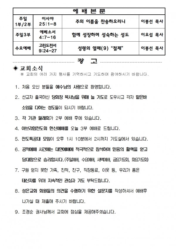 2022년 10월 9일 예배본문 & 교회소식 페이지 정보 작성자 성은교회 작성일22-10-07 16:57 조회5,525회 관련링크 이전글 다음글 목록 본문 2022년 10월 9일 예배본문 & 교회소식 이전글 다음글 목록