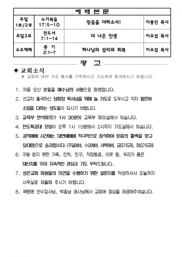 2022년 10월 16일 예배본문 & 교회소식 페이지 정보 작성자 성은교회 작성일22-10-14 16:45 조회5,581회 관련링크 이전글 다음글 목록 본문 2022년 10월 16일 예배본문 & 교회소식 이전글 다음글 목록