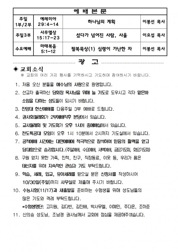2022년 10월 23일 예배본문 & 교회소식 페이지 정보 작성자 성은교회 작성일22-10-21 11:55 조회5,509회 관련링크 이전글 다음글 목록 본문 2022년 10월 23일 예배본문 & 교회소식 이전글 다음글 목록