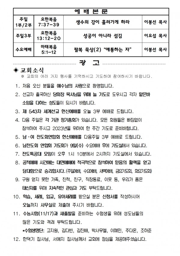 2022년 11월 6일 예배본문 & 교회소식 페이지 정보 작성자 성은교회 작성일22-11-04 14:04 조회5,413회 관련링크 이전글 다음글 목록 본문 2022년 11월 6일 예배본문 & 교회소식 이전글 다음글 목록