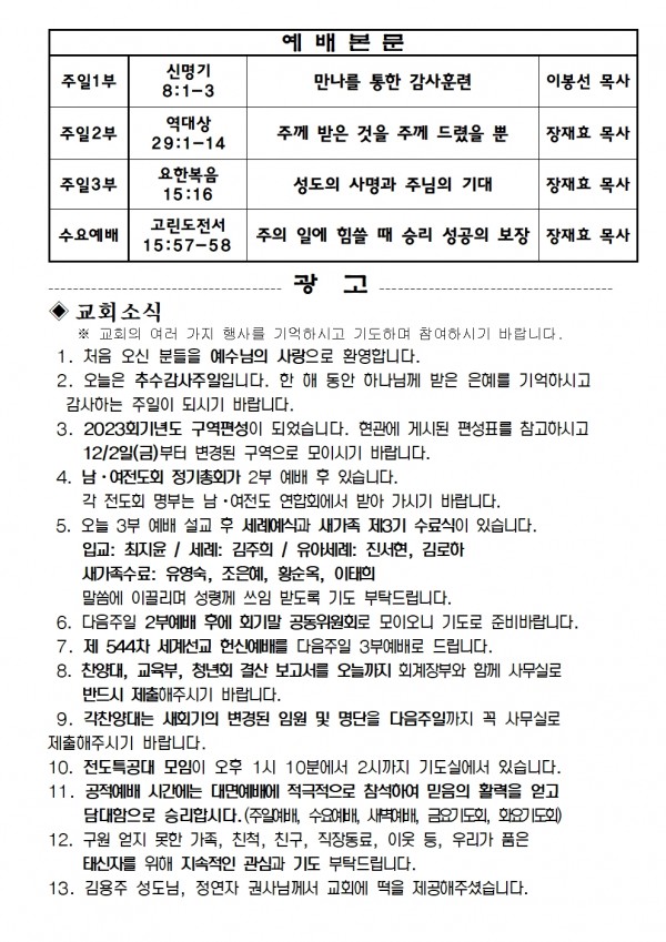 2022년 11월 27일 예배본문 & 교회소식 페이지 정보 작성자 성은교회 작성일22-11-25 18:11 조회5,386회 관련링크 이전글 다음글 목록 본문 2022년 11월 27일 예배본문 & 교회소식 이전글 다음글 목록