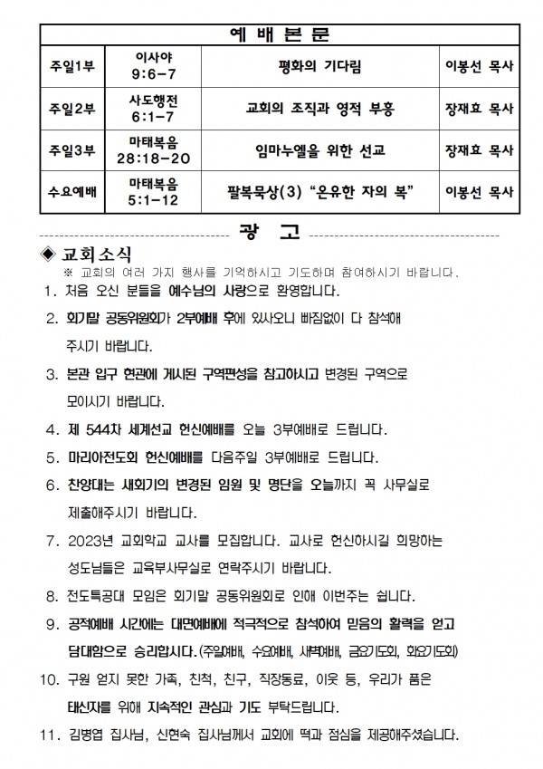 2022년 12월 4일 예배본문 & 교회소식 페이지 정보 작성자 성은교회 작성일22-12-02 17:30 조회5,377회 관련링크 이전글 다음글 목록 본문 2022년 12월 4일 예배본문 & 교회소식 이전글 다음글 목록