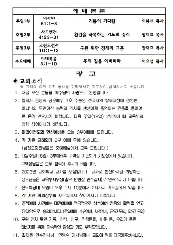 2022년 12월 11일 예배본문 & 교회소식 페이지 정보 작성자 성은교회 작성일22-12-10 13:08 조회5,349회 관련링크 이전글 다음글 목록 본문 2022년 12월 11일 예배본문 & 교회소식 이전글 다음글 목록