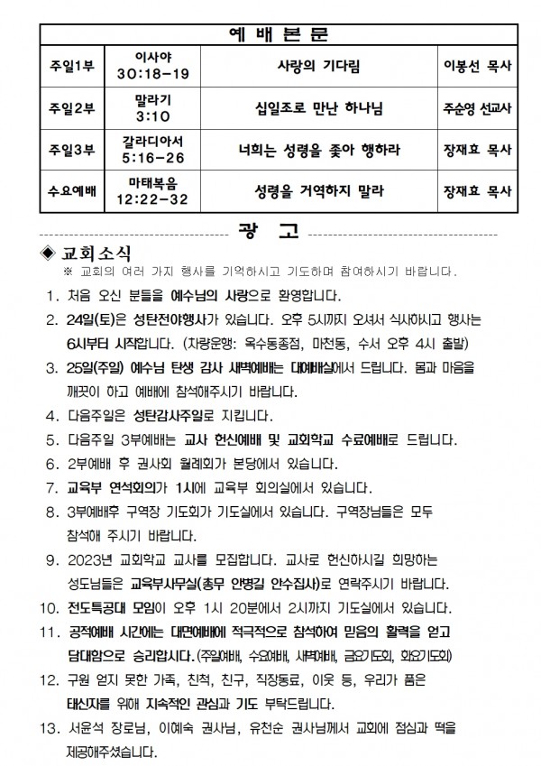 2022년 12월 18일 예배본문 & 교회소식 페이지 정보 작성자 성은교회 작성일22-12-16 18:02 조회5,383회 관련링크 이전글 다음글 목록 본문 2022년 12월 18일 예배본문 & 교회소식 이전글 다음글 목록