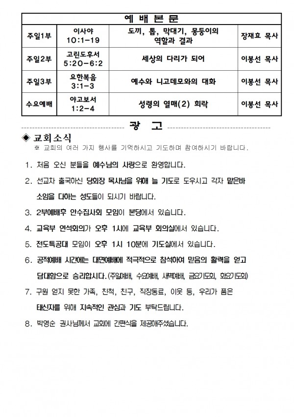 2022년 6월 19일 예배본문 & 교회소식 페이지 정보 작성자 성은교회 작성일22-06-17 13:44 조회5,766회 관련링크 이전글 다음글 목록 본문 2022년 6월 19일 예배본문 & 교회소식 이전글 다음글 목록