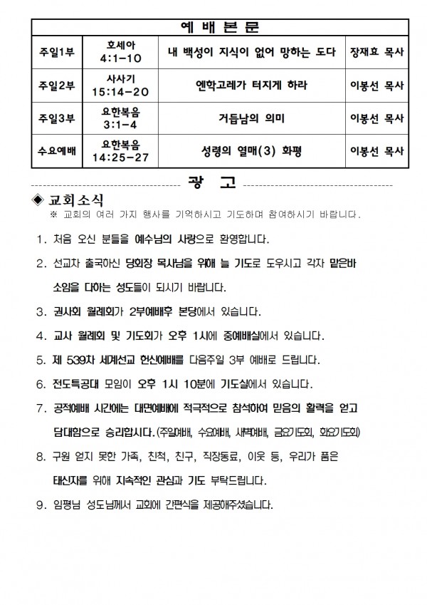 2022년 6월 26일 예배본문 & 교회소식 페이지 정보 작성자 성은교회 작성일22-06-24 15:12 조회5,713회 관련링크 이전글 다음글 목록 본문 2022년 6월 26일 예배본문 & 교회소식 이전글 다음글 목록