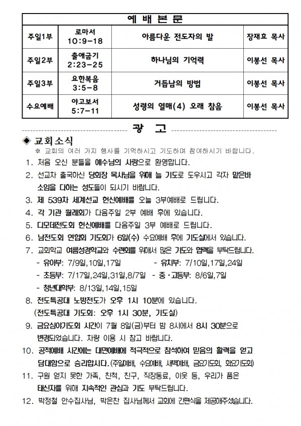 2022년 7월 3일 예배본문 & 교회소식 페이지 정보 작성자 성은교회 작성일22-07-01 14:01 조회5,739회 관련링크 이전글 다음글 목록 본문 2022년 7월 3일 예배본문 & 교회소식 이전글 다음글 목록