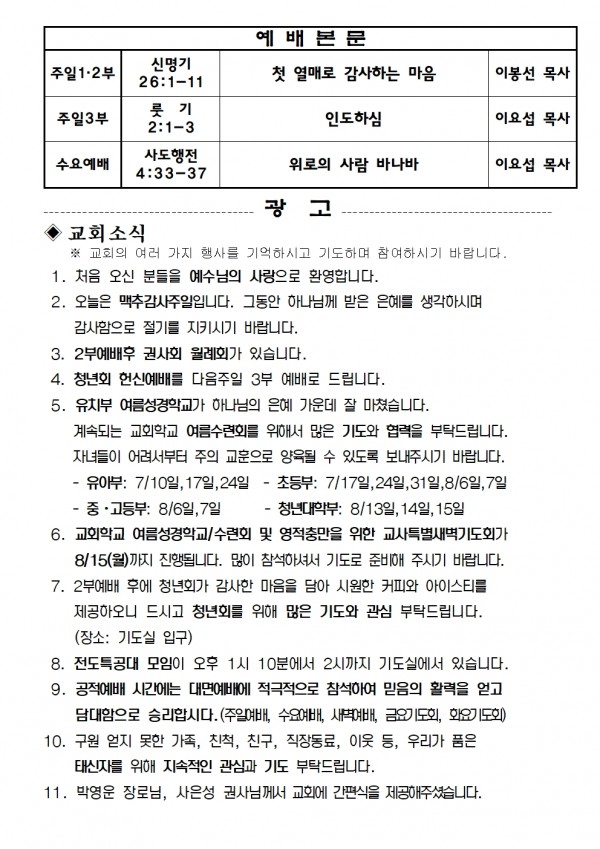 2022년 7월 24일 예배본문 & 교회소식 페이지 정보 작성자 성은교회 작성일22-07-22 12:04 조회5,629회 관련링크 이전글 다음글 목록 본문 2022년 7월 24일 예배본문 & 교회소식 이전글 다음글 목록