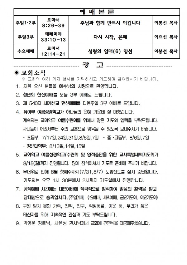 2022년 7월 31일 예배본문 & 교회소식 페이지 정보 작성자 성은교회 작성일22-07-30 13:09 조회5,645회 관련링크 이전글 다음글 목록 본문 2022년 7월 31일 예배본문 & 교회소식 이전글 다음글 목록