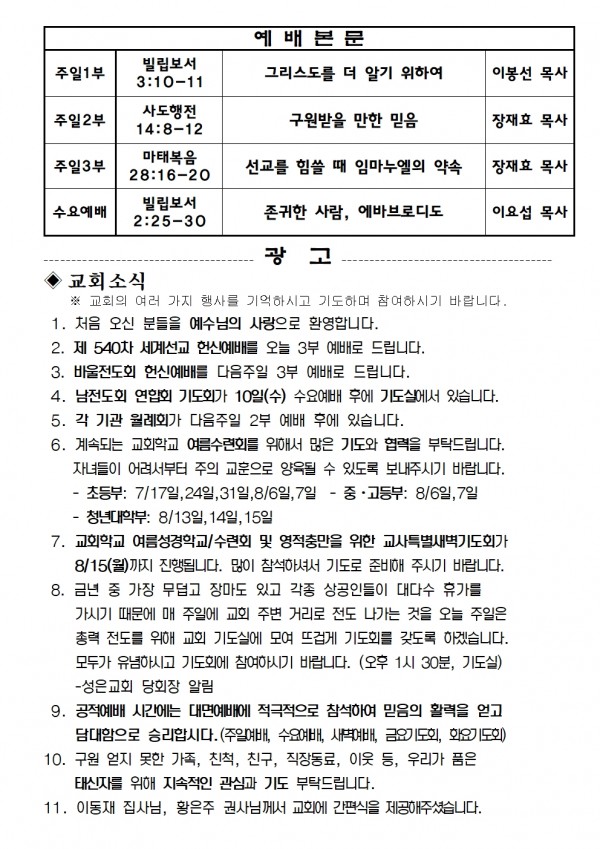 2022년 8월 7일 예배본문 & 교회소식 페이지 정보 작성자 성은교회 작성일22-08-05 16:43 조회5,662회 관련링크 이전글 다음글 목록 본문 2022년 8월 7일 예배본문 & 교회소식 이전글 다음글 목록