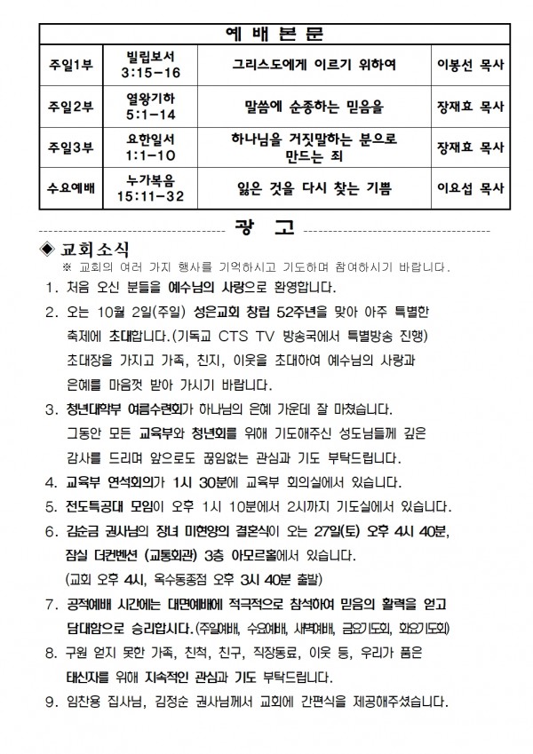 2022년 8월 21일 예배본문 & 교회소식 페이지 정보 작성자 성은교회 작성일22-08-19 16:45 조회5,544회 관련링크 이전글 다음글 목록 본문 2022년 8월 21일 예배본문 & 교회소식 이전글 다음글 목록