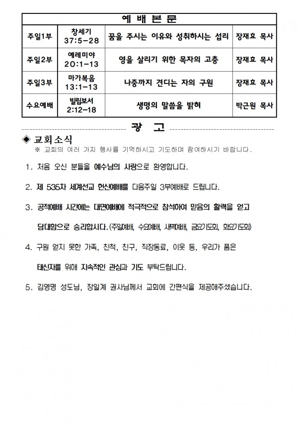2022년 2월 27일 예배본문 & 교회소식 페이지 정보 작성자 성은교회 작성일22-02-25 16:48 조회5,954회 관련링크 이전글 다음글 목록 본문 2022년 2월 27일 예배본문 & 교회소식 이전글 다음글 목록