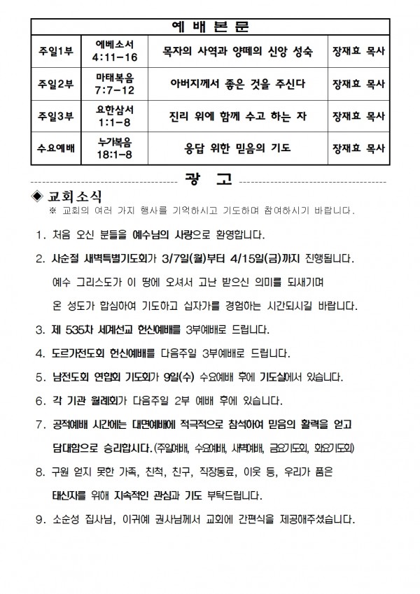 2022년 3월 6일 예배본문 & 교회소식 페이지 정보 작성자 성은교회 작성일22-03-04 16:30 조회5,880회 관련링크 이전글 다음글 목록 본문 2022년 3월 6일 예배본문 & 교회소식 이전글 다음글 목록