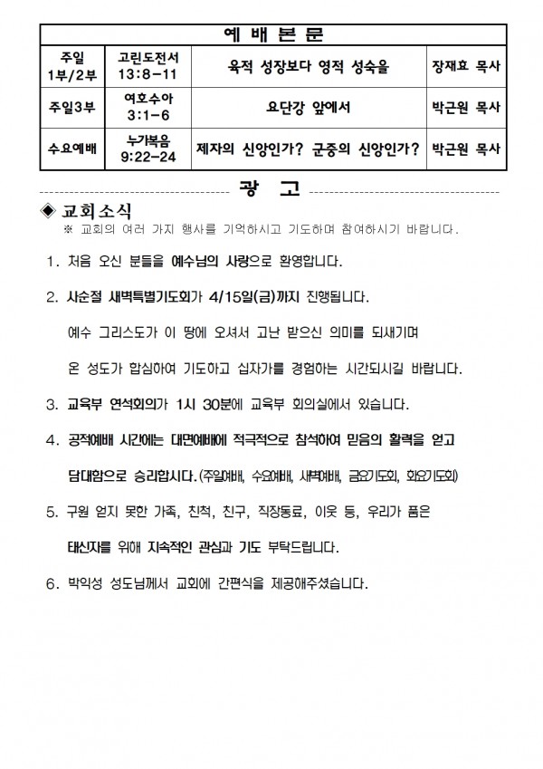 2022년 3월 20일 예배본문 & 교회소식 페이지 정보 작성자 성은교회 작성일22-03-18 17:17 조회5,899회 관련링크 이전글 다음글 목록 본문 2022년 3월 20일 예배본문 & 교회소식 이전글 다음글 목록