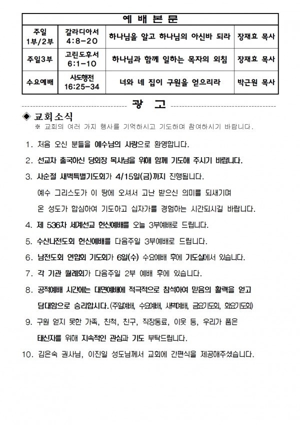 2022년 4월 3일 예배본문 & 교회소식 페이지 정보 작성자 성은교회 작성일22-04-01 11:08 조회5,815회 관련링크 이전글 다음글 목록 본문 2022년 4월 3일 예배본문 & 교회소식 이전글 다음글 목록