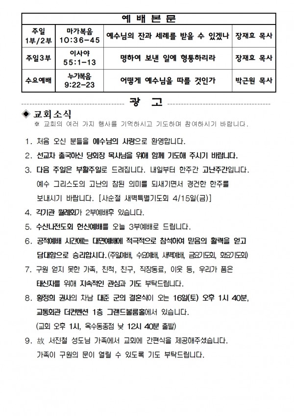 2022년 4월 10일 예배본문 & 교회소식 페이지 정보 작성자 성은교회 작성일22-04-08 16:59 조회5,845회 관련링크 이전글 다음글 목록 본문 2022년 4월 10일 예배본문 & 교회소식 이전글 다음글 목록