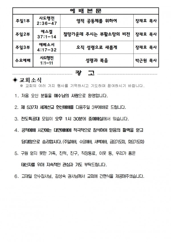 2022년 4월 24일 예배본문 & 교회소식 페이지 정보 작성자 성은교회 작성일22-04-22 16:37 조회5,830회 관련링크 이전글 다음글 목록 본문 2022년 4월 24일 예배본문 & 교회소식 이전글 다음글 목록