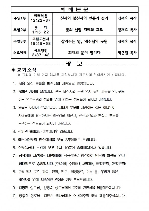 2022년 5월 8일 예배본문 & 교회소식 페이지 정보 작성자 성은교회 작성일22-05-06 15:01 조회5,753회 관련링크 이전글 다음글 목록 본문 2022년 5월 8일 예배본문 & 교회소식 이전글 다음글 목록