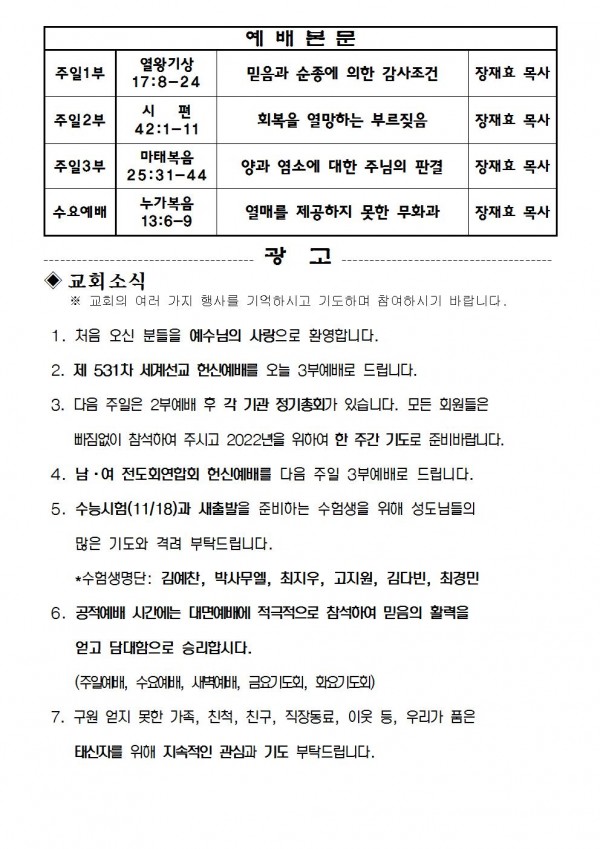 2021년 11월 7일 예배본문 & 교회소식 페이지 정보 작성자 성은교회 작성일21-11-05 16:13 조회6,215회 관련링크 이전글 다음글 목록 본문 2021년 11월 7일 예배본문 & 교회소식 이전글 다음글 목록