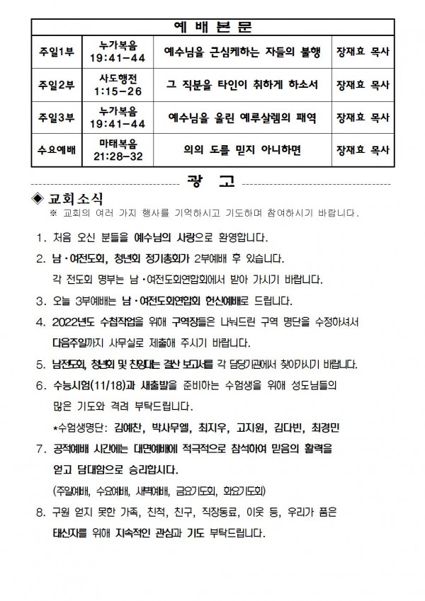 2021년 11월 14일 예배본문 & 교회소식 페이지 정보 작성자 성은교회 작성일21-11-12 16:55 조회6,180회 관련링크 이전글 다음글 목록 본문 2021년 11월 14일 예배본문 & 교회소식 이전글 다음글 목록