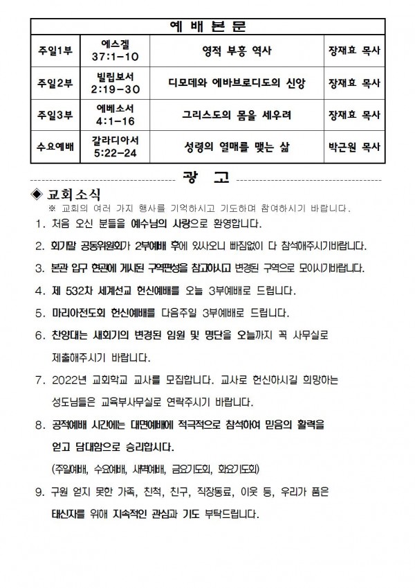 2021년 12월 5일 예배본문 & 교회소식 페이지 정보 작성자 성은교회 작성일21-12-04 17:53 조회6,125회 관련링크 이전글 다음글 목록 본문 2021년 12월 5일 예배본문 & 교회소식 이전글 다음글 목록