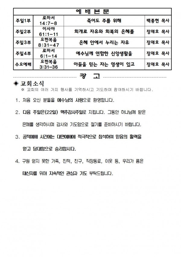 2021년 8월 15일 예배본문 & 교회소식 페이지 정보 작성자 성은교회 작성일21-08-13 16:49 조회6,273회 관련링크 이전글 다음글 목록 본문 2021년 8월 15일 예배본문 & 교회소식 이전글 다음글 목록