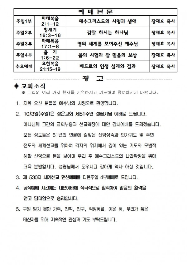 2021년 9월 26일 예배본문 & 교회소식 페이지 정보 작성자 성은교회 작성일21-09-24 18:47 조회6,172회 관련링크 이전글 다음글 목록 본문 2021년 9월 26일 예배본문 & 교회소식 이전글 다음글 목록
