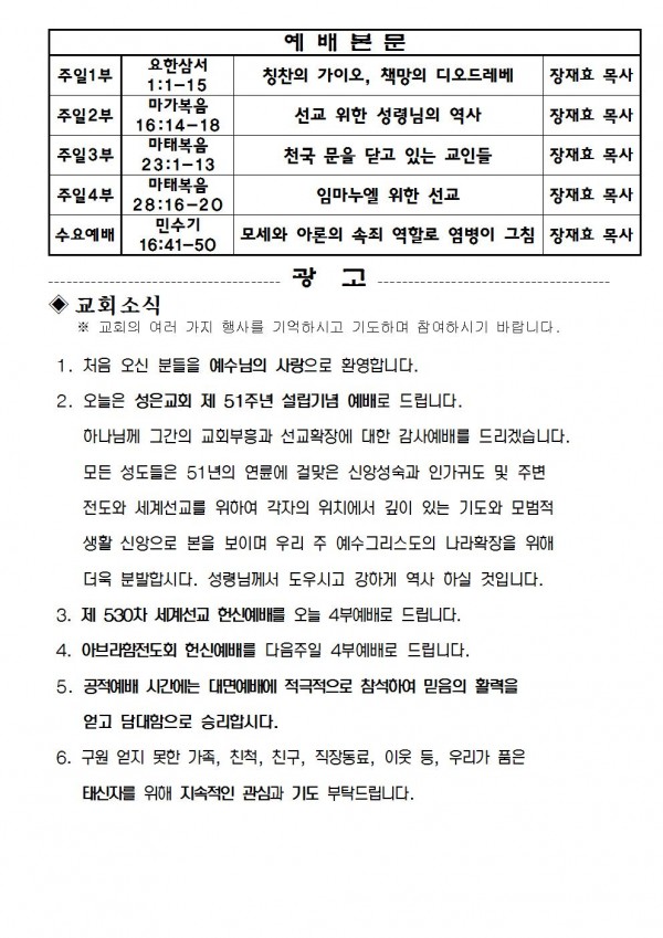 2021년 10월 3일 예배본문 & 교회소식 페이지 정보 작성자 성은교회 작성일21-10-01 11:41 조회6,229회 관련링크 이전글 다음글 목록 본문 2021년 10월 3일 예배본문 & 교회소식 이전글 다음글 목록