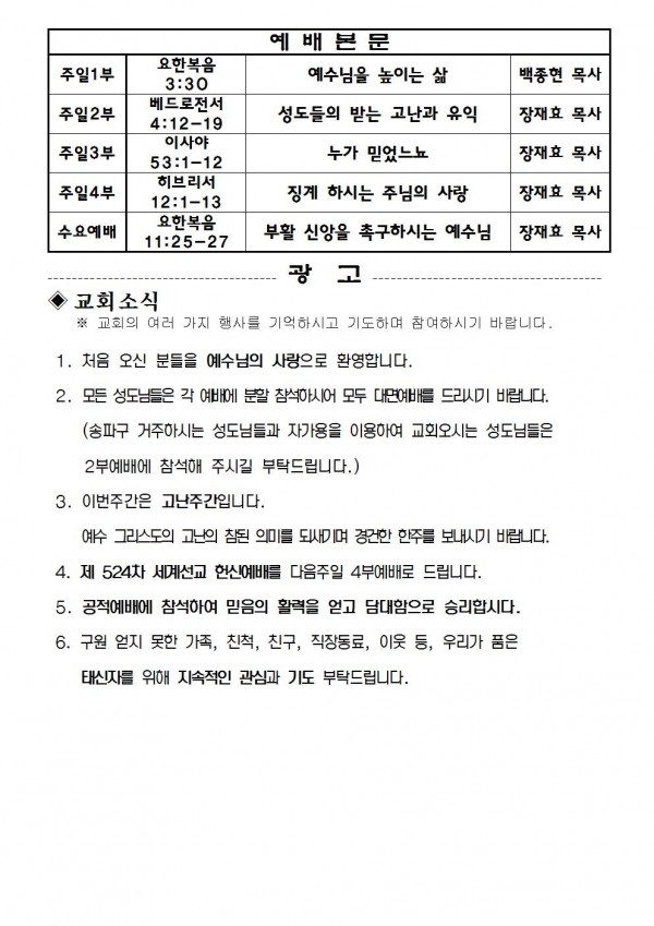 2021년 3월 28일 예배본문 & 교회소식 페이지 정보 작성자 성은교회 작성일21-03-26 15:55 조회6,561회 관련링크 이전글 다음글 목록 본문 2021년 3월 28일 예배본문 & 교회소식 이전글 다음글 목록