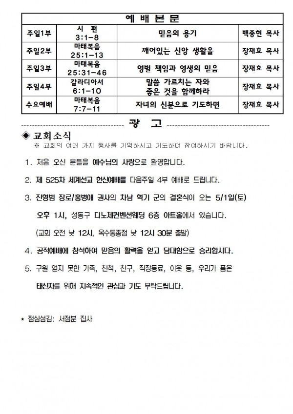 2021년 4월 25일 예배본문 & 교회소식 페이지 정보 작성자 성은교회 작성일21-04-23 16:19 조회6,563회 관련링크 이전글 다음글 목록 본문 2021년 4월 25일 예배본문 & 교회소식 이전글 다음글 목록