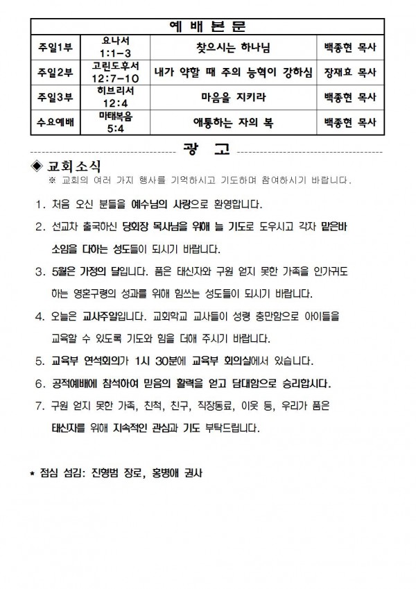 2021년 5월 16일 예배본문 & 교회소식 페이지 정보 작성자 성은교회 작성일21-05-14 16:07 조회6,433회 관련링크 이전글 다음글 목록 본문 2021년 5월 16일 예배본문 & 교회소식 이전글 다음글 목록