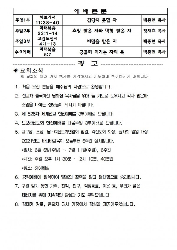 2021년 6월 6일 예배본문 & 교회소식 페이지 정보 작성자 성은교회 작성일21-06-04 15:21 조회6,344회 관련링크 이전글 다음글 목록 본문 2021년 6월 6일 예배본문 & 교회소식 이전글 다음글 목록