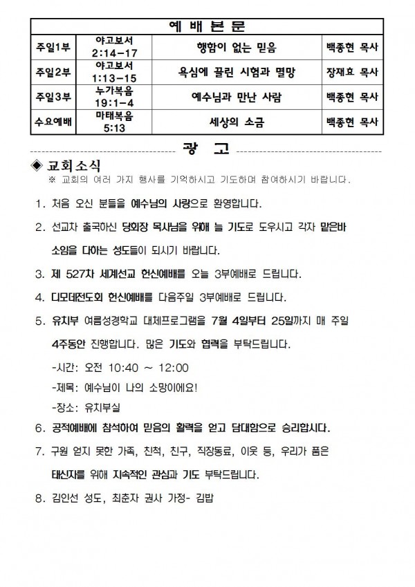 2021년 7월 4일 예배본문 & 교회소식 페이지 정보 작성자 성은교회 작성일21-07-02 11:32 조회6,285회 관련링크 이전글 다음글 목록 본문 2021년 7월 4일 예배본문 & 교회소식 이전글 다음글 목록