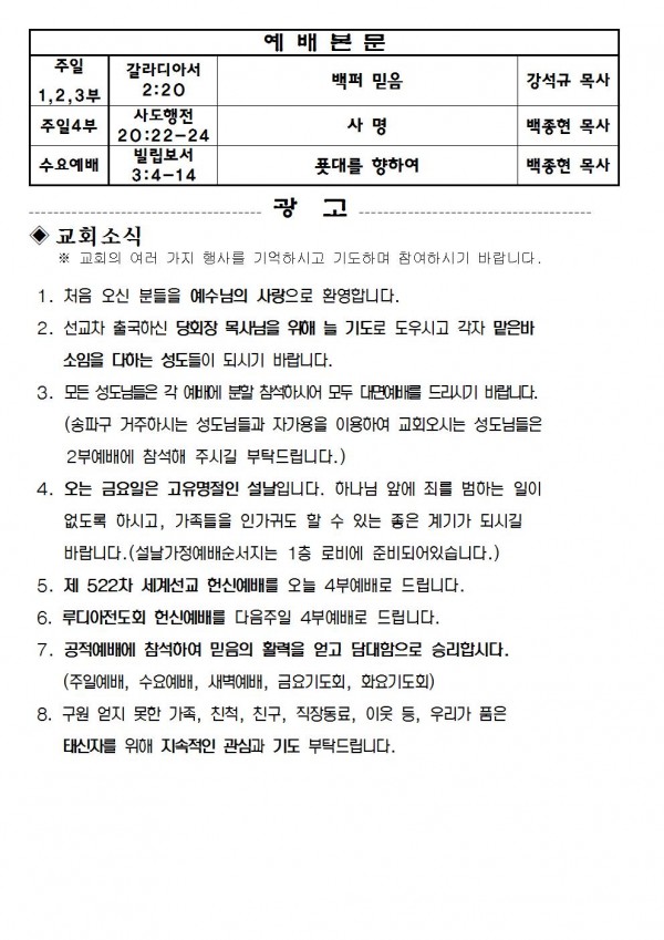 2021년 2월 7일 예배본문 & 교회소식 페이지 정보 작성자 성은교회 작성일21-02-05 11:47 조회6,630회 관련링크 이전글 다음글 목록 본문 2021년 2월 7일 예배본문 & 교회소식 이전글 다음글 목록