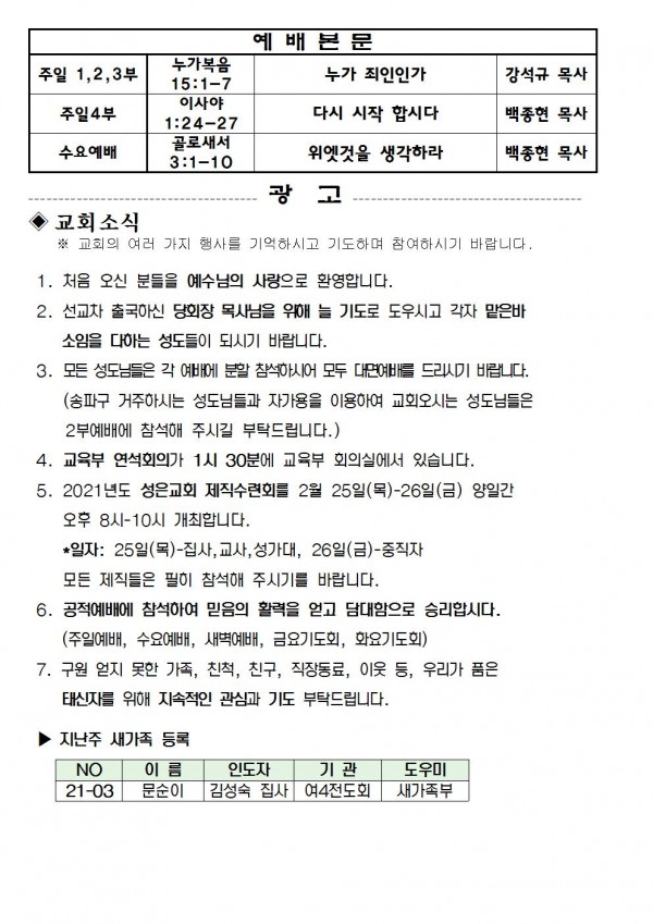 2021년 2월 21일 예배본문 & 교회소식 페이지 정보 작성자 성은교회 작성일21-02-18 16:40 조회6,636회 관련링크 이전글 다음글 목록 본문 2021년 2월 21일 예배본문 & 교회소식 이전글 다음글 목록