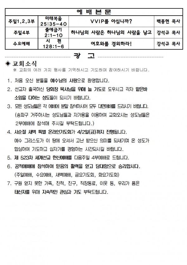 2021년 2월 28일 예배본문 & 교회소식 페이지 정보 작성자 성은교회 작성일21-02-26 15:28 조회6,613회 관련링크 이전글 다음글 목록 본문 2021년 2월 28일 예배본문 & 교회소식 이전글 다음글 목록