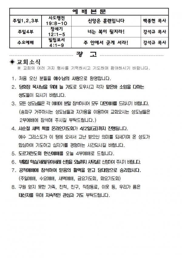 2021년 3월 14일 예배본문 & 교회소식 페이지 정보 작성자 성은교회 작성일21-03-12 15:43 조회6,582회 관련링크 이전글 다음글 목록 본문 2021년 3월 14일 예배본문 & 교회소식 이전글 다음글 목록