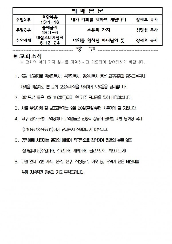 2020년 9월 13일 예배본문 & 교회소식 페이지 정보 작성자 성은교회 작성일20-09-11 17:04 조회7,183회 관련링크 이전글 다음글 목록 본문 2020년 9월 13일 예배본문 & 교회소식 이전글 다음글 목록
