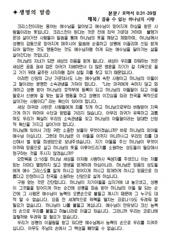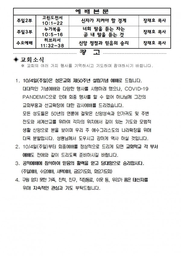2020년 9월 27일 예배본문 & 교회소식 페이지 정보 작성자 성은교회 작성일20-09-25 16:58 조회7,095회 관련링크 이전글 다음글 목록 본문 2020년 9월 27일 예배본문 & 교회소식 이전글 다음글 목록