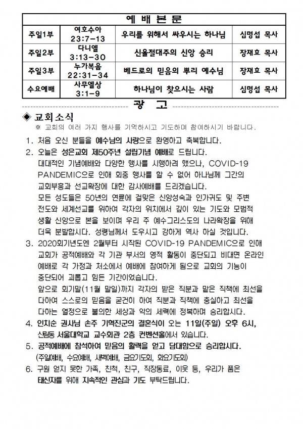 2020년 10월 4일 예배본문 & 교회소식 페이지 정보 작성자 성은교회 작성일20-09-30 20:30 조회7,033회 관련링크 이전글 다음글 목록 본문 2020년 10월 4일 예배본문 & 교회소식 이전글 다음글 목록