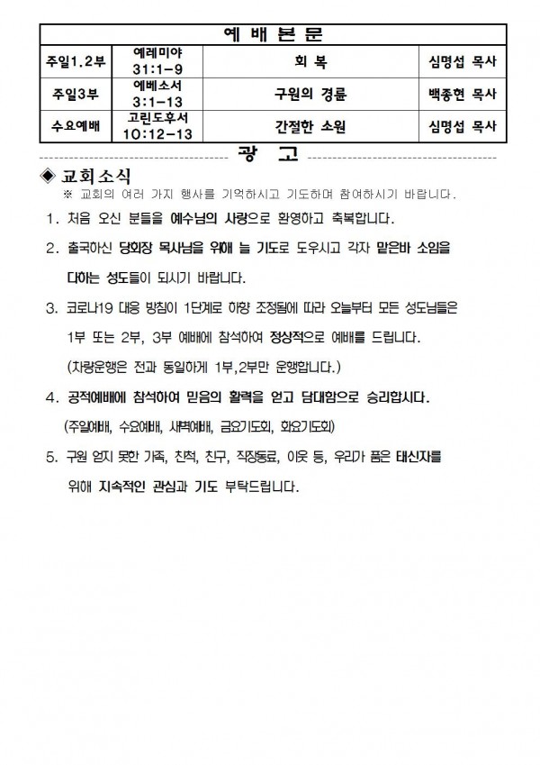 2020년 10월 18일 예배본문 & 교회소식 페이지 정보 작성자 성은교회 작성일20-10-16 16:55 조회6,905회 관련링크 이전글 다음글 목록 본문 2020년 10월 18일 예배본문 & 교회소식 이전글 다음글 목록