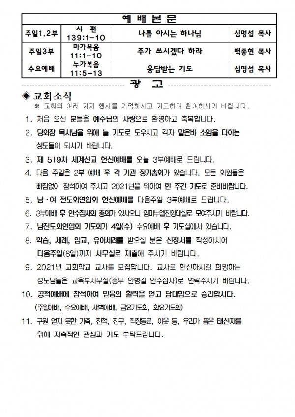 2020년 11월 1일 예배본문 & 교회소식 페이지 정보 작성자 성은교회 작성일20-10-30 15:56 조회6,791회 관련링크 이전글 다음글 목록 본문 2020년 11월 1일 예배본문 & 교회소식 이전글 다음글 목록