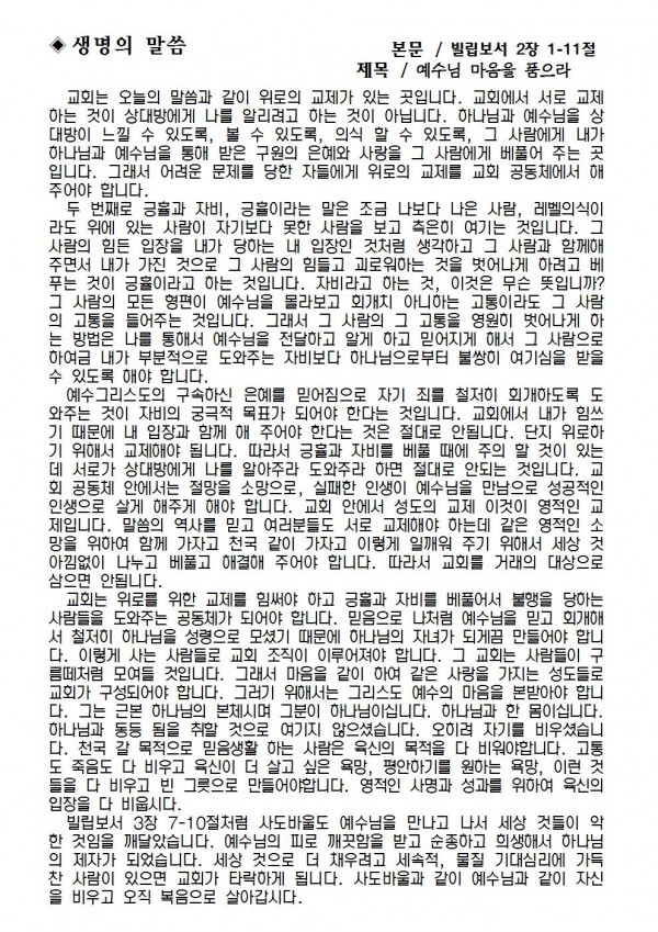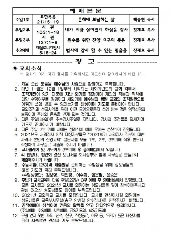 2020년 11월 22일 예배본문 & 교회소식 페이지 정보 작성자 성은교회 작성일20-11-20 11:24 조회6,776회 관련링크 이전글 다음글 목록 본문 2020년 11월 22일 예배본문 & 교회소식 이전글 다음글 목록
